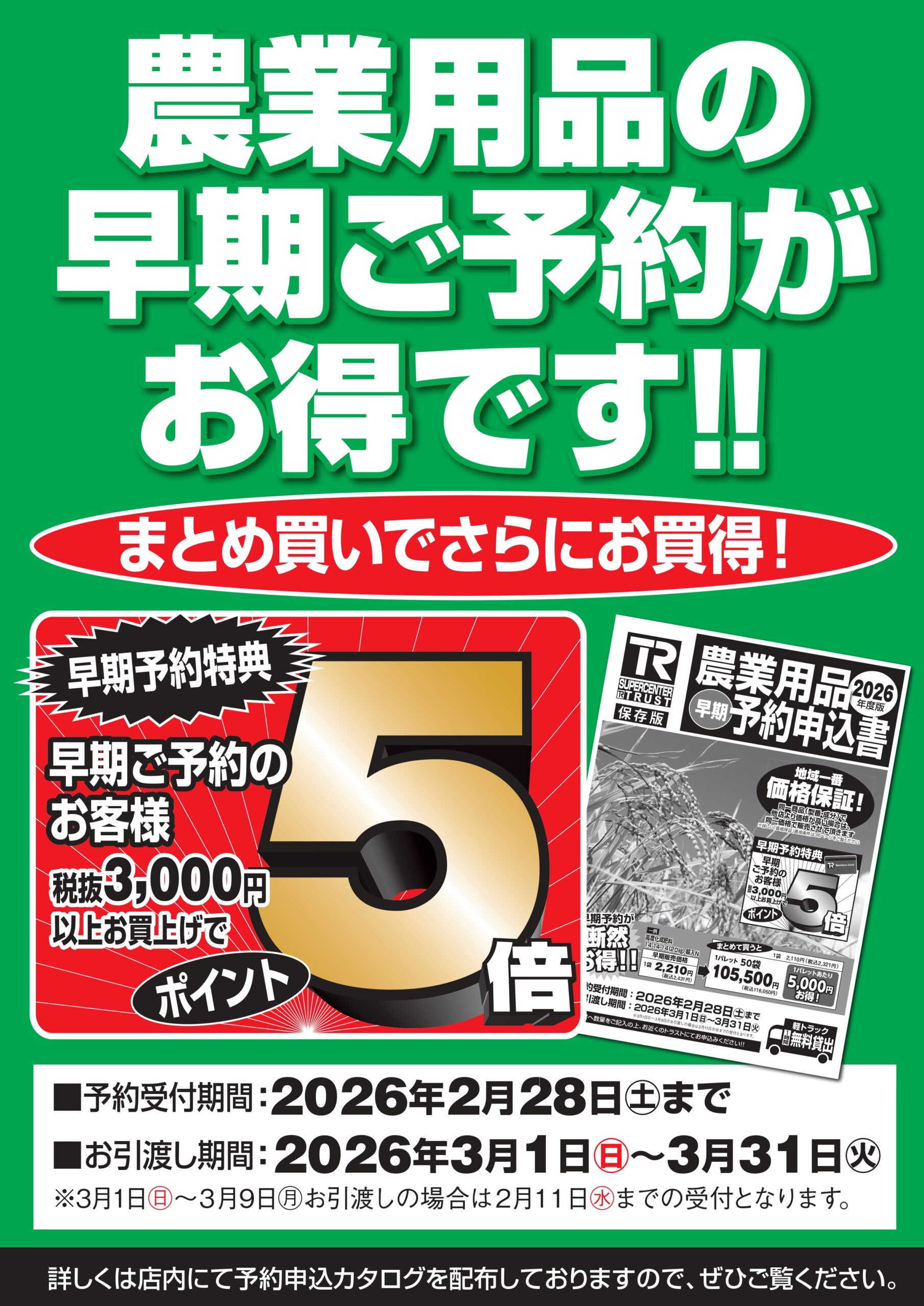 2026年度農業用品早期予約開始 ご好評いただいております農業用品の早期予約が今年も始まりました。 今回も大変お求めやすい価格となっております。 また、早期予約特典として税抜3,000円以上のお買上げでポイントが5倍になります!! 受付期間は2026年2月28日(土)までとなっております。 農業用品ご購入をご検討の方、ぜひこの機会にお近くのスーパーセンタートラストへお越しください! ↓※ご予約用のカタログがご覧いただけます。下の「商品詳細はコチラ」をタップしてください。(PDF形式)