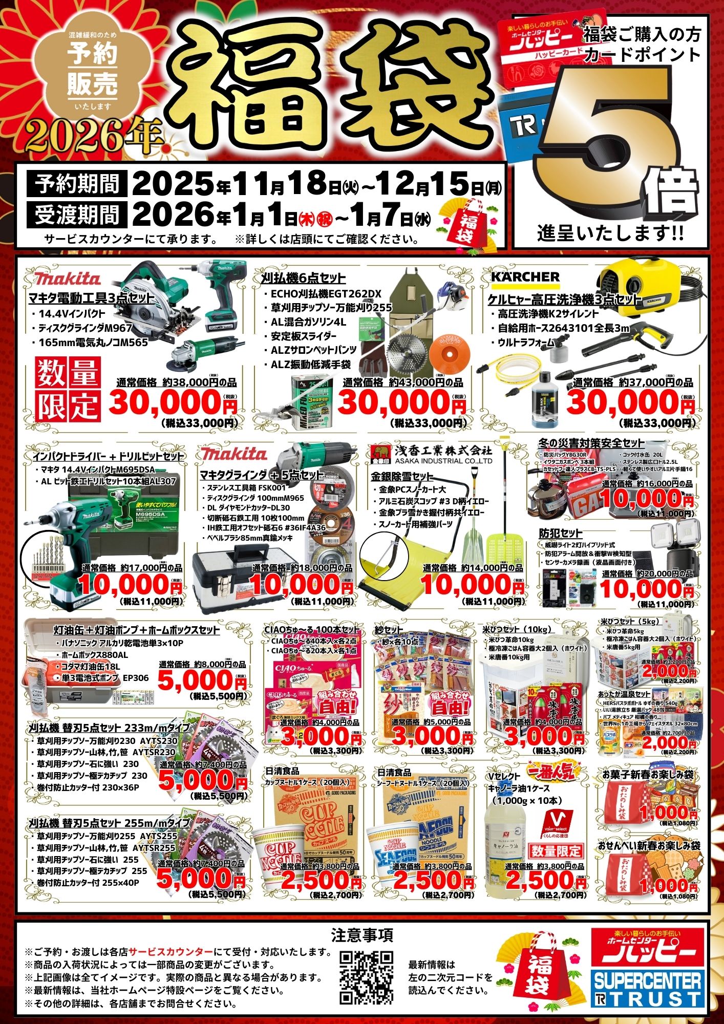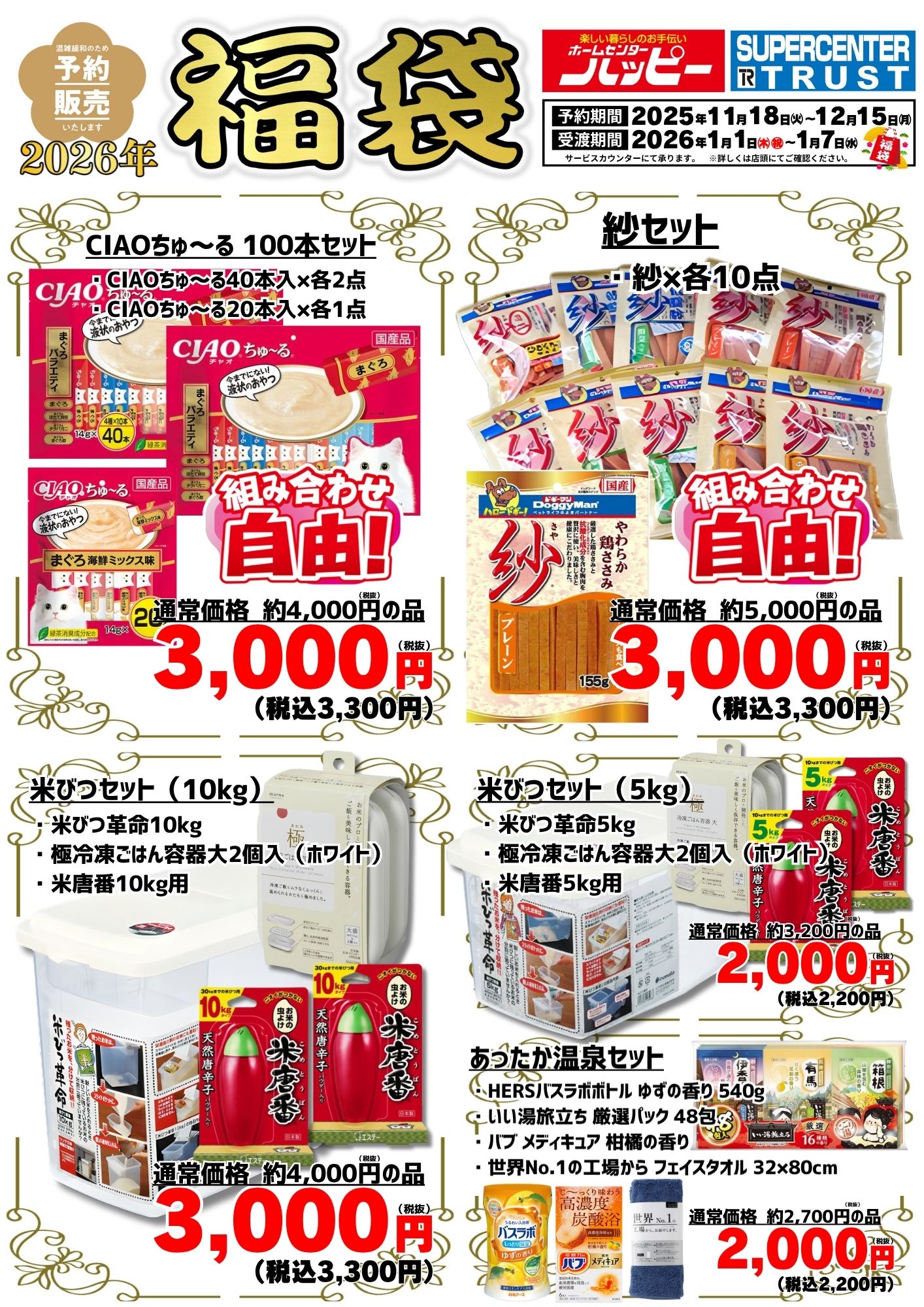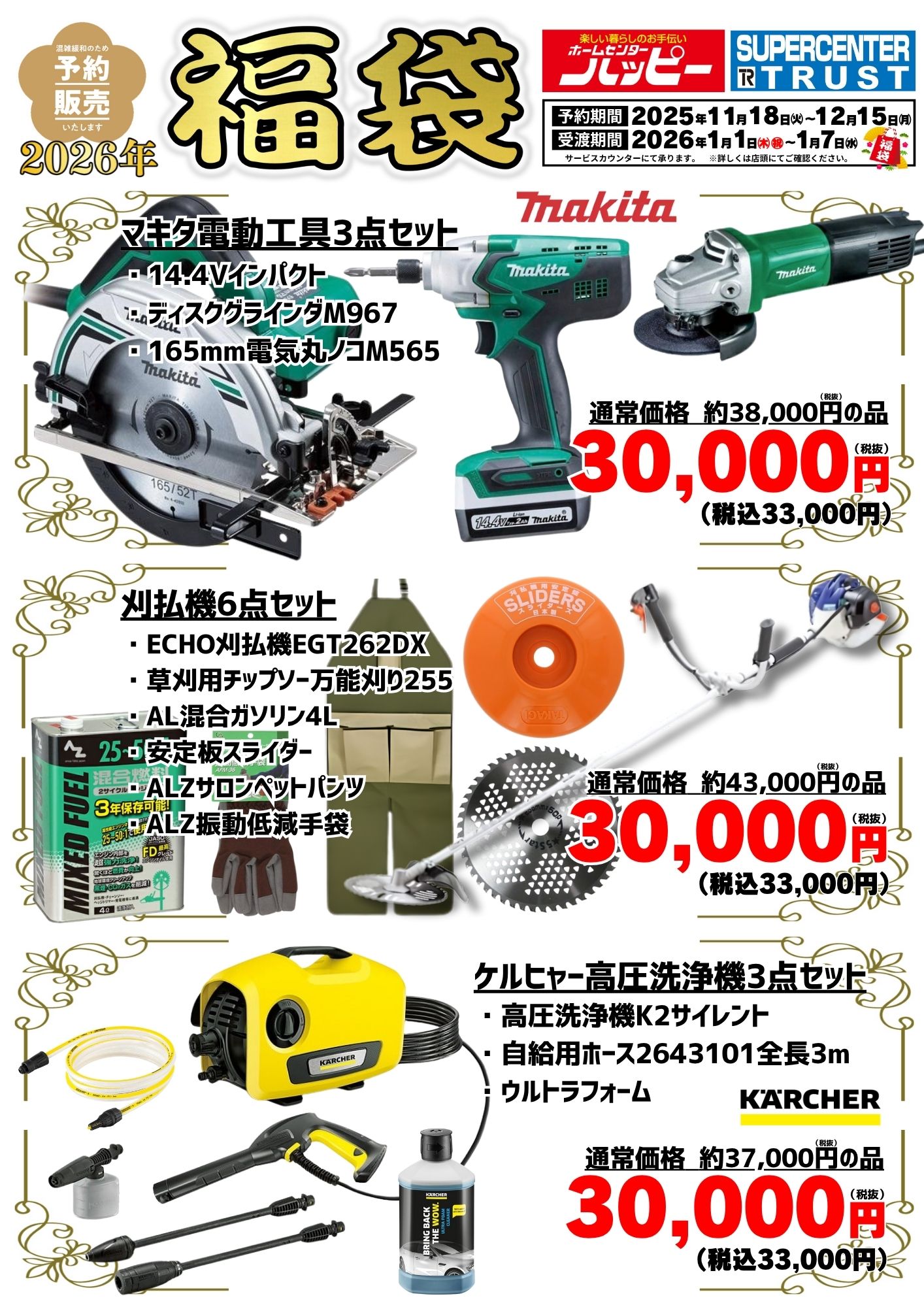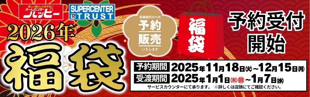 【2026福袋】予約販売開始 ホームセンターハッピー各店・スーパーセンタートラスト各店において、11月18日(火)より福袋の予約を承っております。お得な商品が目白押しです! 商品リストは下の画像をご確認ください