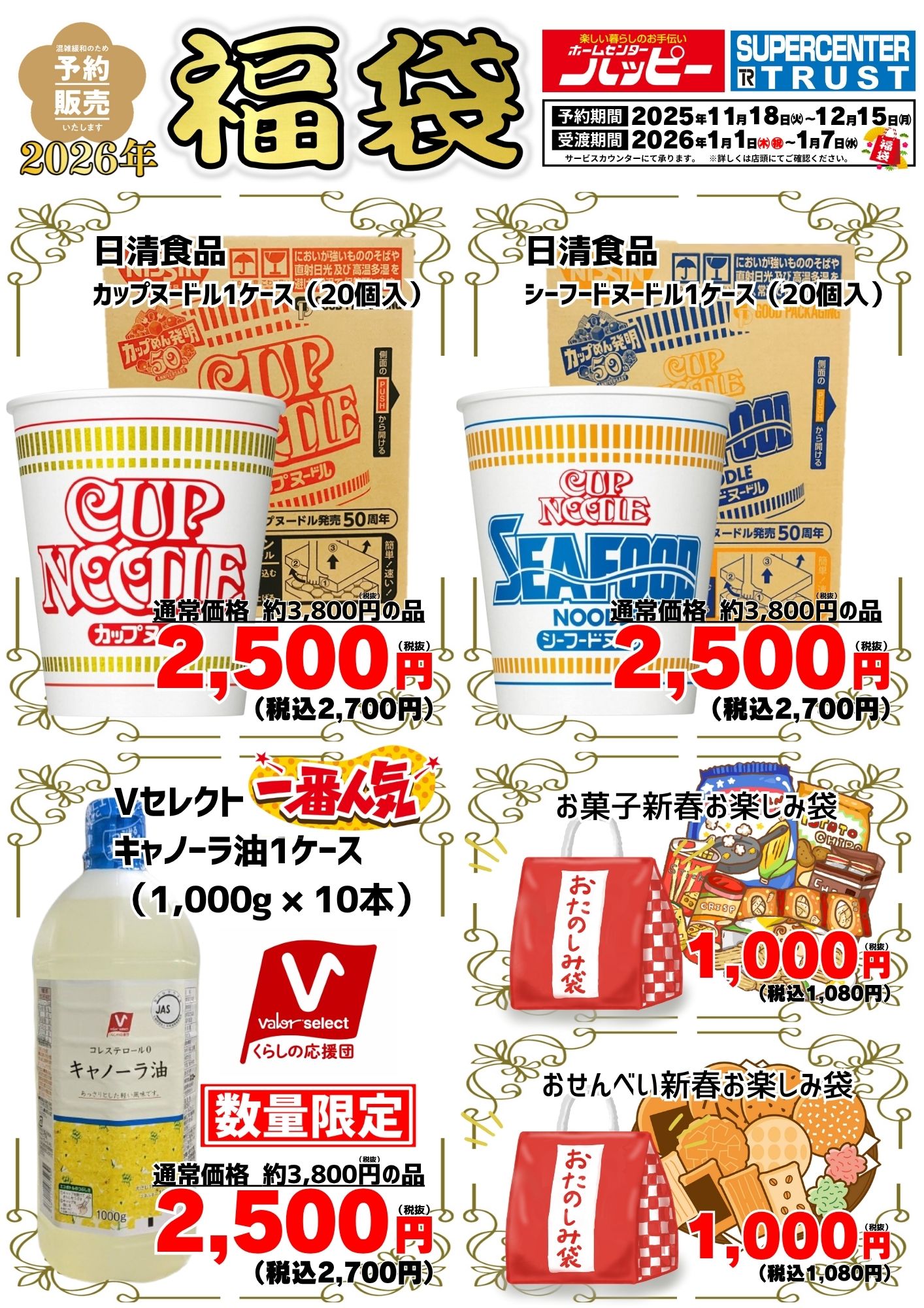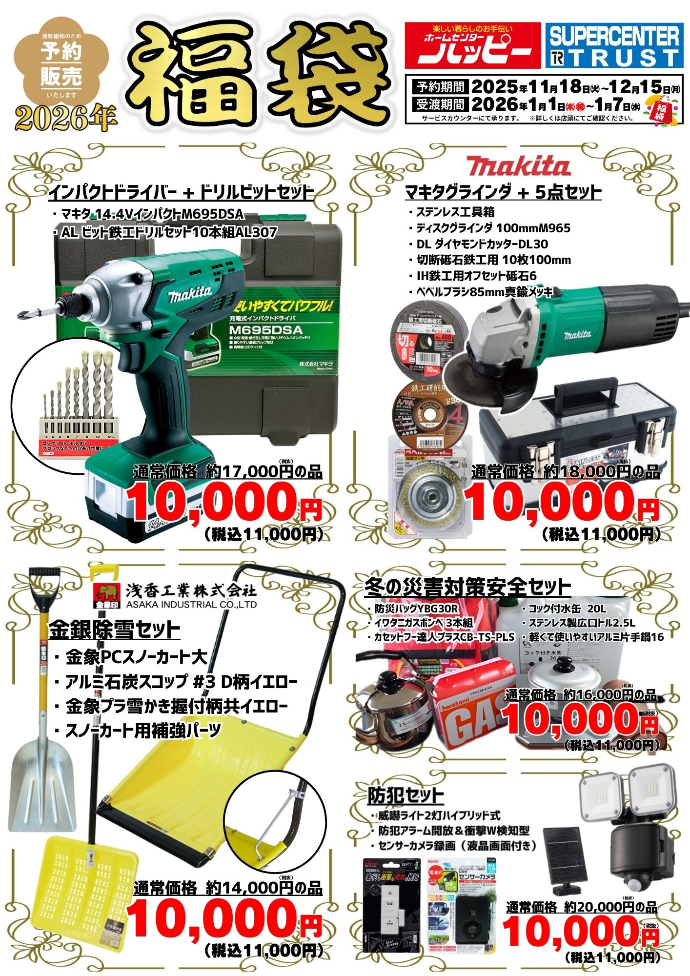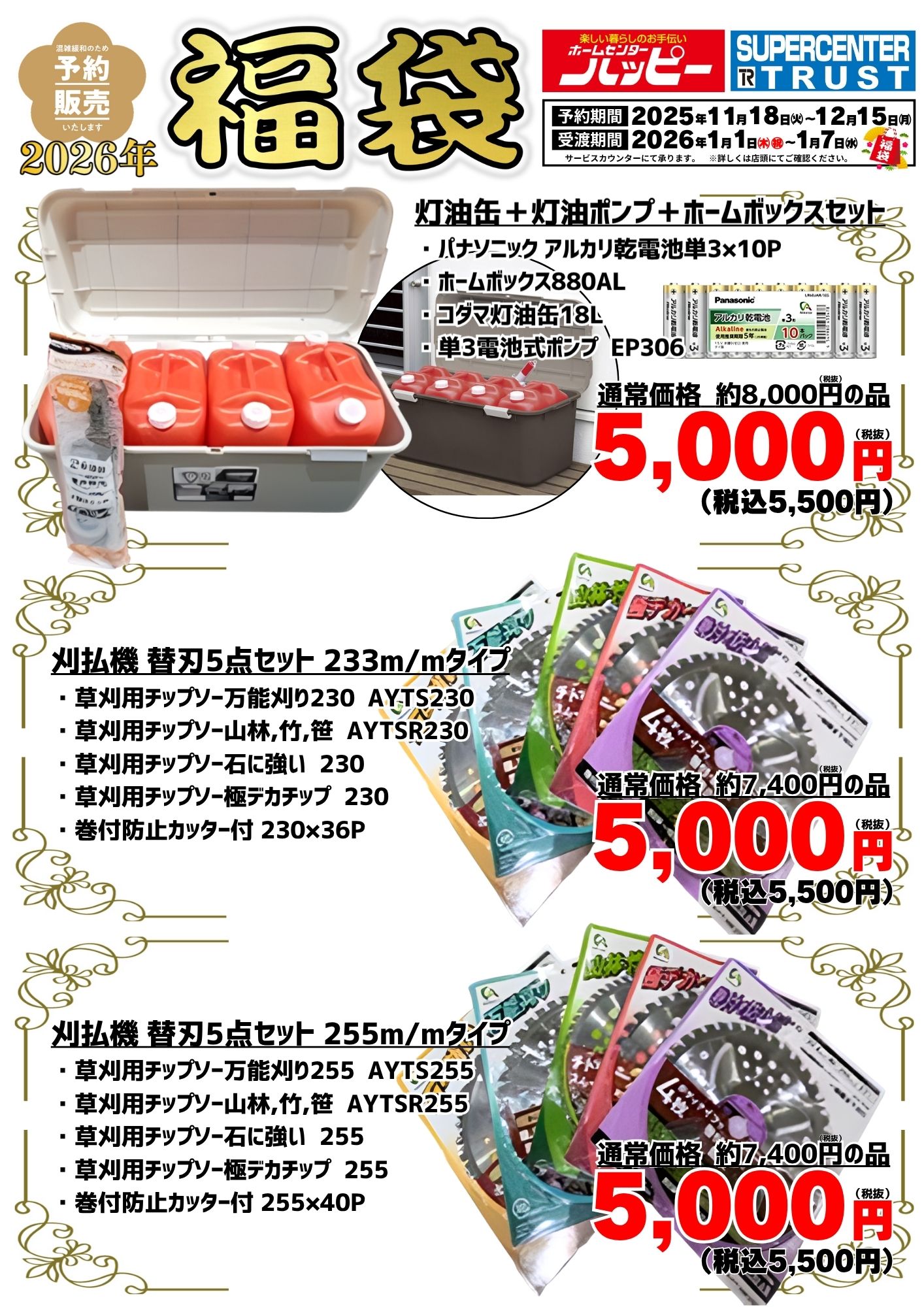 【2026福袋】予約販売開始 ホームセンターハッピー各店・スーパーセンタートラスト各店において、11月18日(火)より福袋の予約を承っております。お得な商品が目白押しです! 商品リストは下の画像をご確認ください