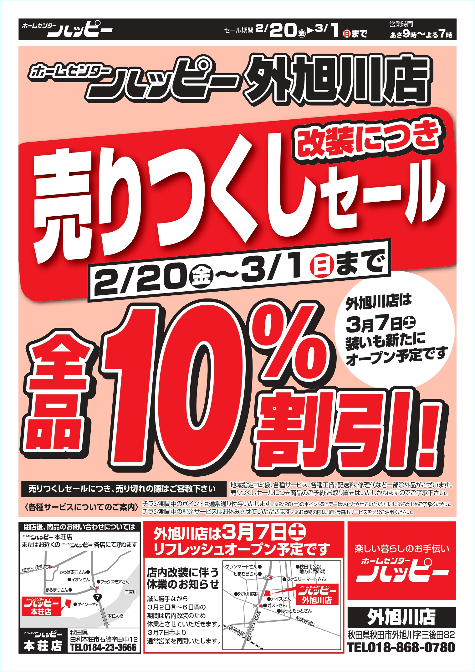 改装に伴う「売りつくしセール」実施について ホームセンターハッピー外旭川店で、改装に伴う「売りつくしセール」を開催します。 期間:2月20日(金)~3月1日(日)まで 全品10%割引です!※一部割引対象除外品もございます。 店内改装に伴う休業期間:3月2日(月)~3月6日(金) 3月7日(土)より、リフレッシュオープン予定です。