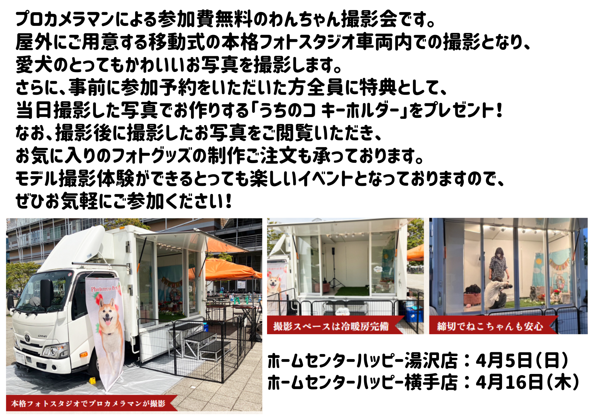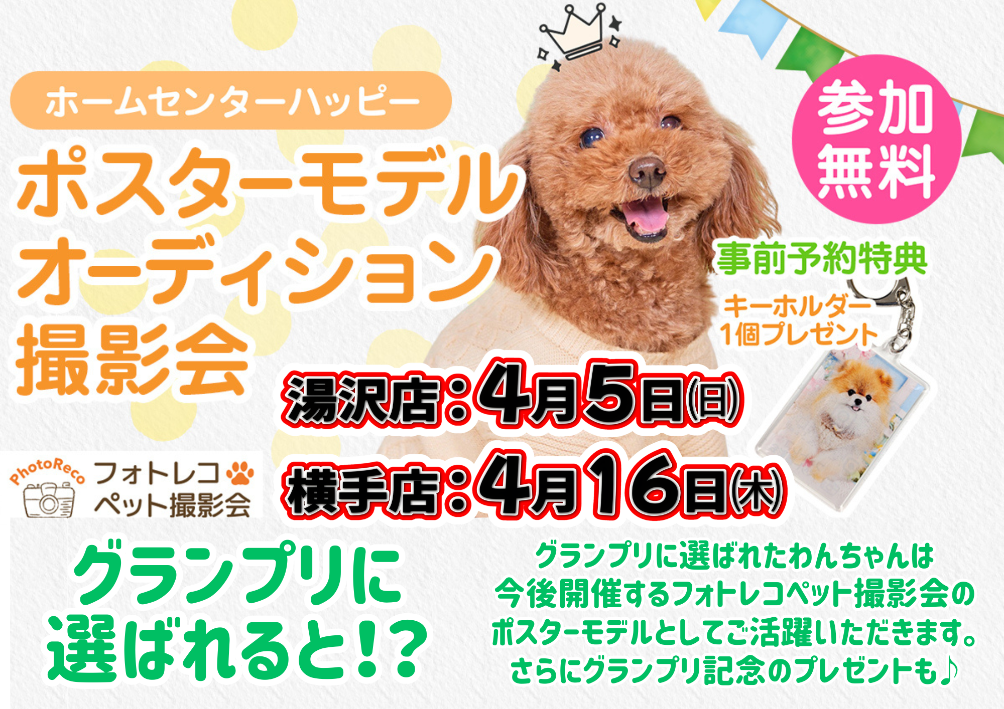 【ホームセンターハッピー湯沢店・横手店】ポスターモデルオーディション『ペット撮影会』開催